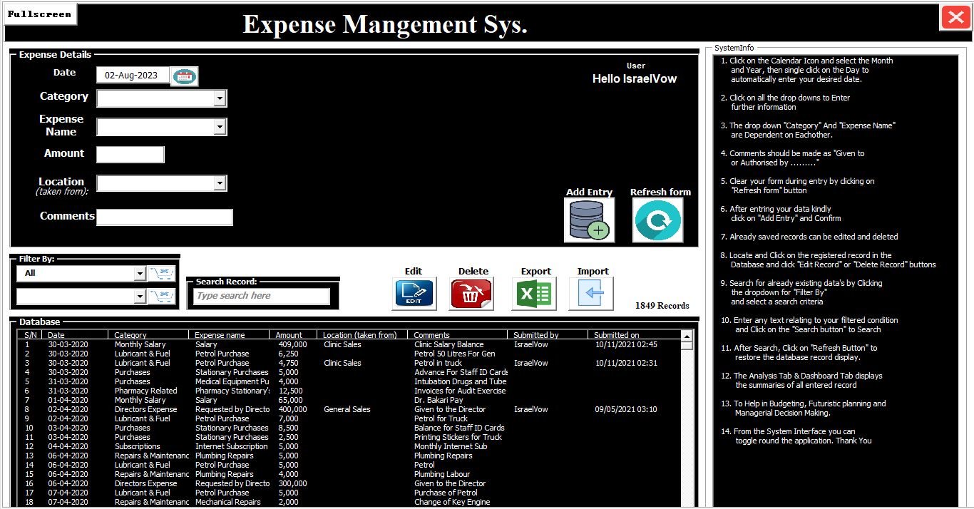Userform Entry: The system features a user-friendly userform that enables users to input expense details, such as date, category, expense name, amount, location, comments, and more.