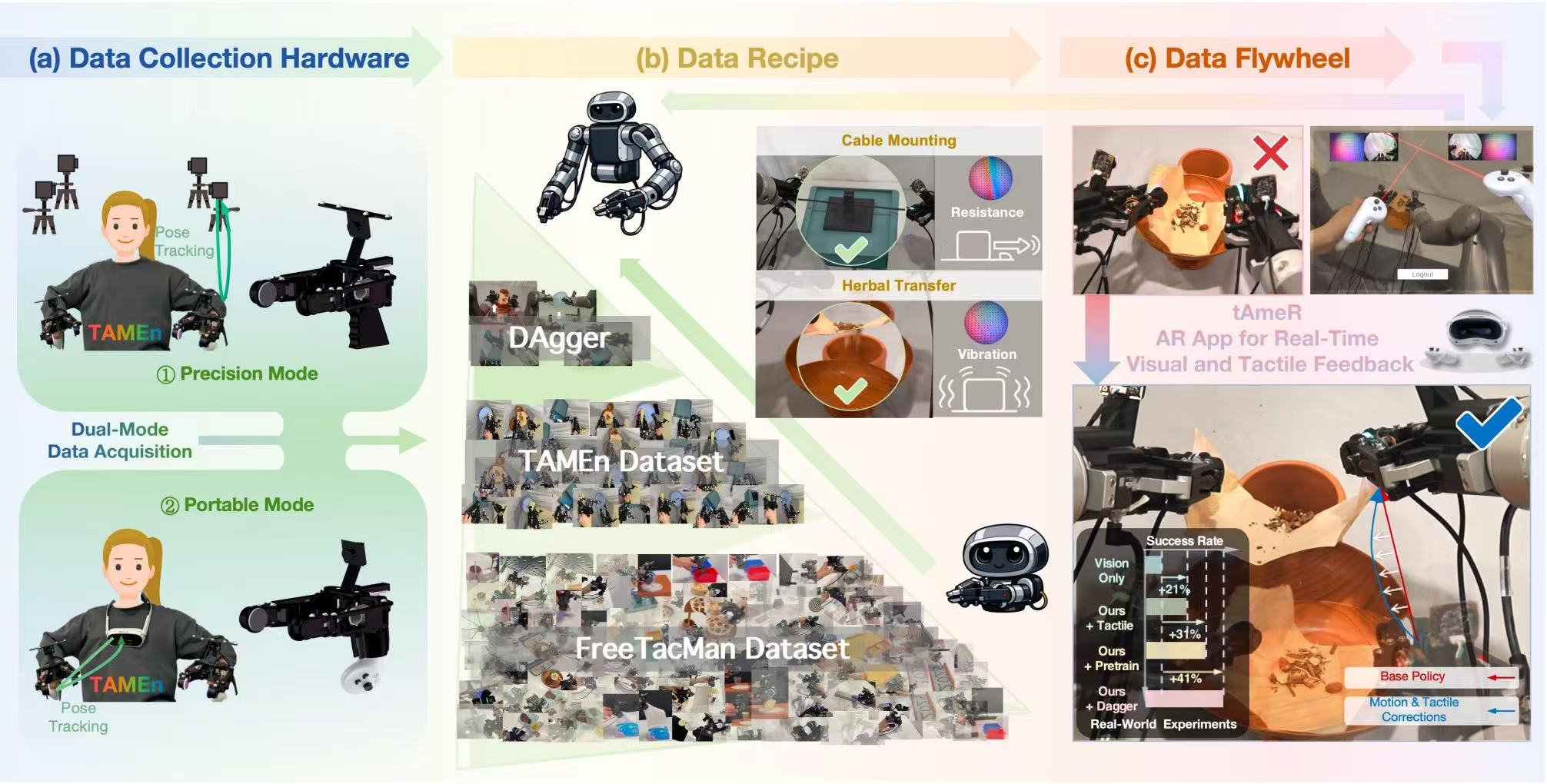 - (iv) A closed-loop data flywheel that leverages AR-based teleoperation with tactile feedback (tAmeR) to refine policies using corrective data from realistic failures.