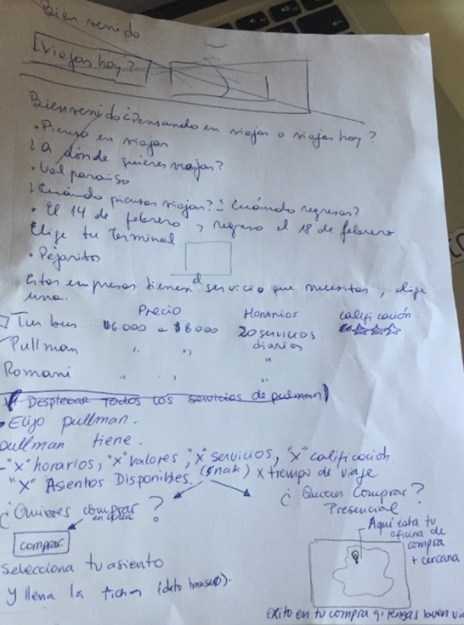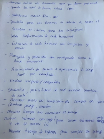Para realizar las entrevistas en este proceso de la investigación, fuimos a entrevistar en terreno a los usuarios directos, al terminal de buses de Santiago. Para saber su comportamiento y preferencias con este tipo de servicio. Ahí nos dimos cuenta que la gran mayoría de usuarios son turistas chilenos y extranjeros, ellos esperaban en el terminal su bus de destino y sus pasajes los compraban de manera presencial, pero por medio de la entrevista nos dimos cuenta que ellos si necesitan algo que los ayude a comprar sus pasajes y están dispuestos a obtener sus boletos del bus de una manera digital, que sea más fácil y efectiva para que ellos puedan perder el menor tiempo posible esperando y así puedan disfrutar de mejor manera sus viajes.