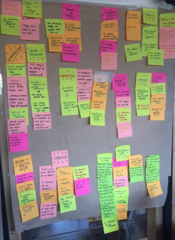 Después de toda la investigación realizada a través de entrevistas, encuestas, benchmark, reclamos del servicio, y observación en terreno se procedió a realizar un affinity mapping con los datos más relevantes sobre los usuarios, para: Encontrar conexiones mediante la asociación de las ideas y puntos claves que fuimos encontrando por medio de la investigación, y así poder recopilar y categorizar los diferentes insights que fuimos encontrando, para planificarnos y analizar cómo podemos llevar estas ideas a una solución para nuestros usuarios.