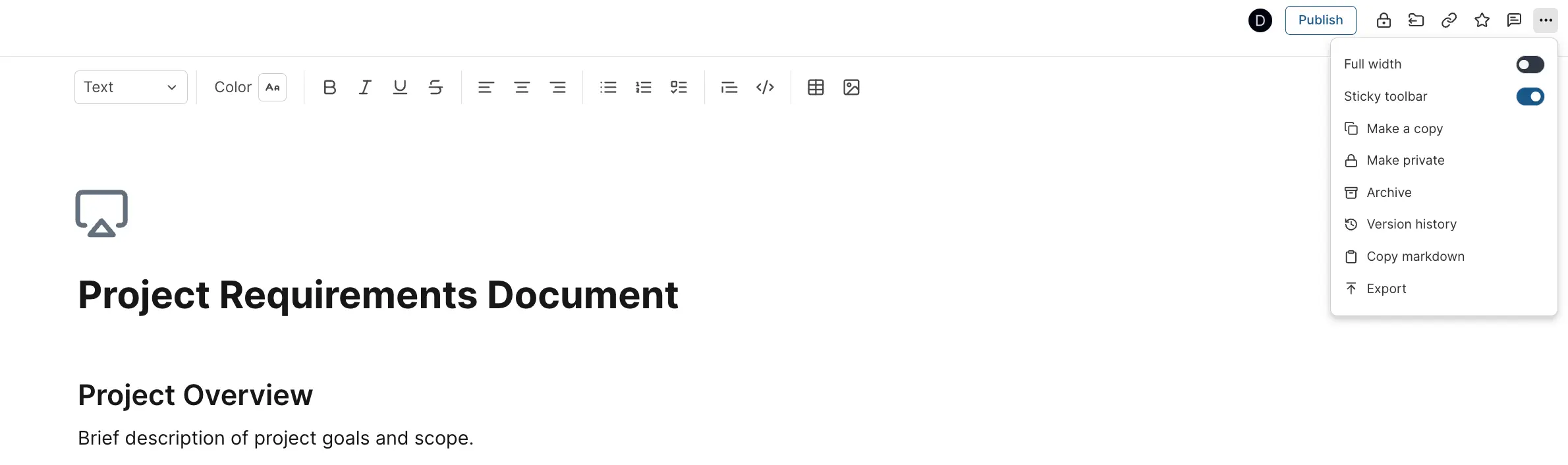 # Project Requirements Document ## Project Overview Brief description of project goals and scope. ## Key Requirements • Requirement 1 • Requirement 2 • Requirement 3 ## Action Items ☐ Task 1 ☐ Task 2 ☐ Task 3