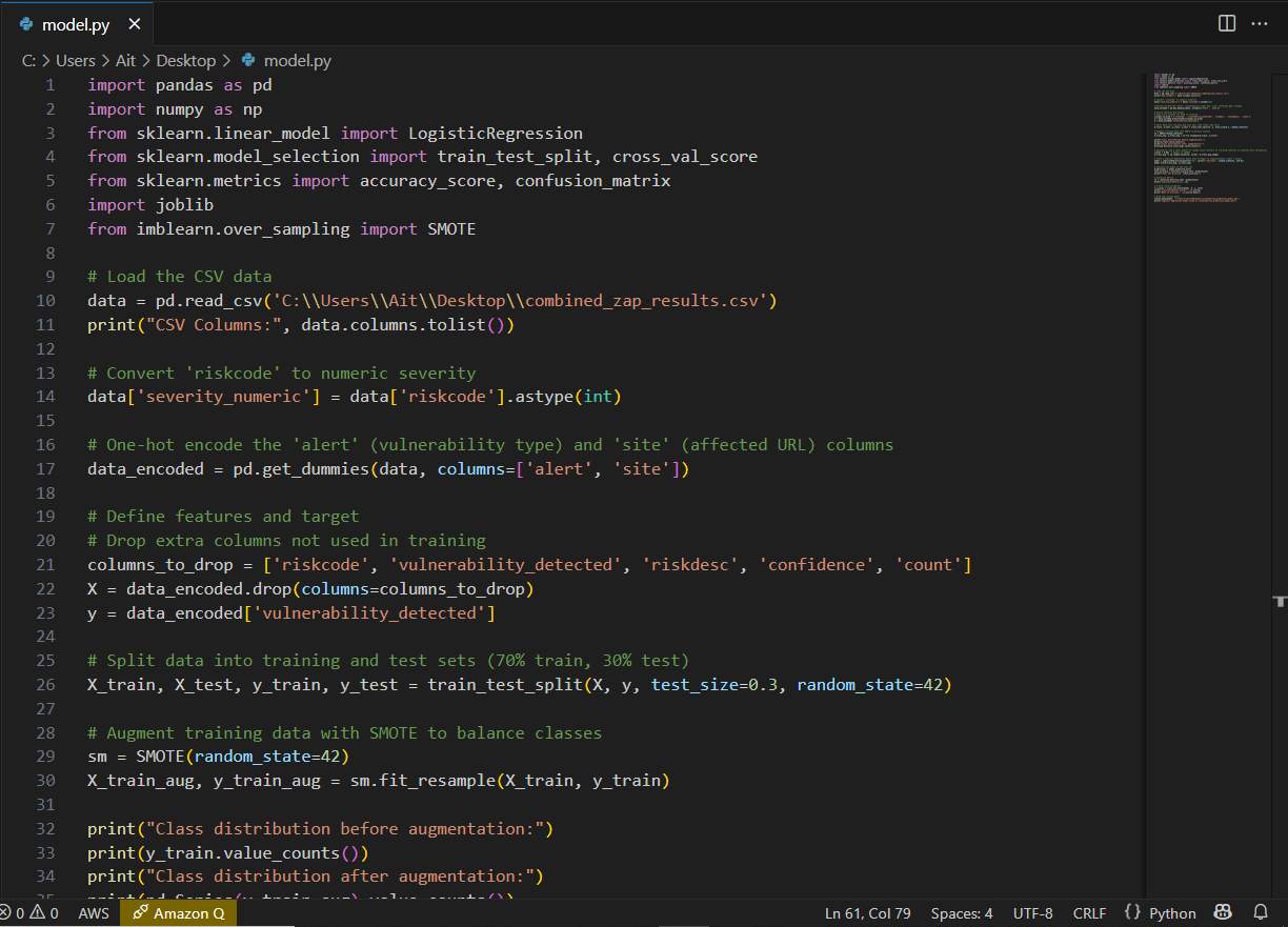- Python: For data preprocessing, machine learning model development (using scikit-learn, joblib, and pandas), and automation of vulnerability prediction.