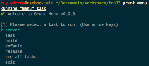 grunt.loadNpmTasks('grunt-menu');To invoke the menu just run the grunt menu task: