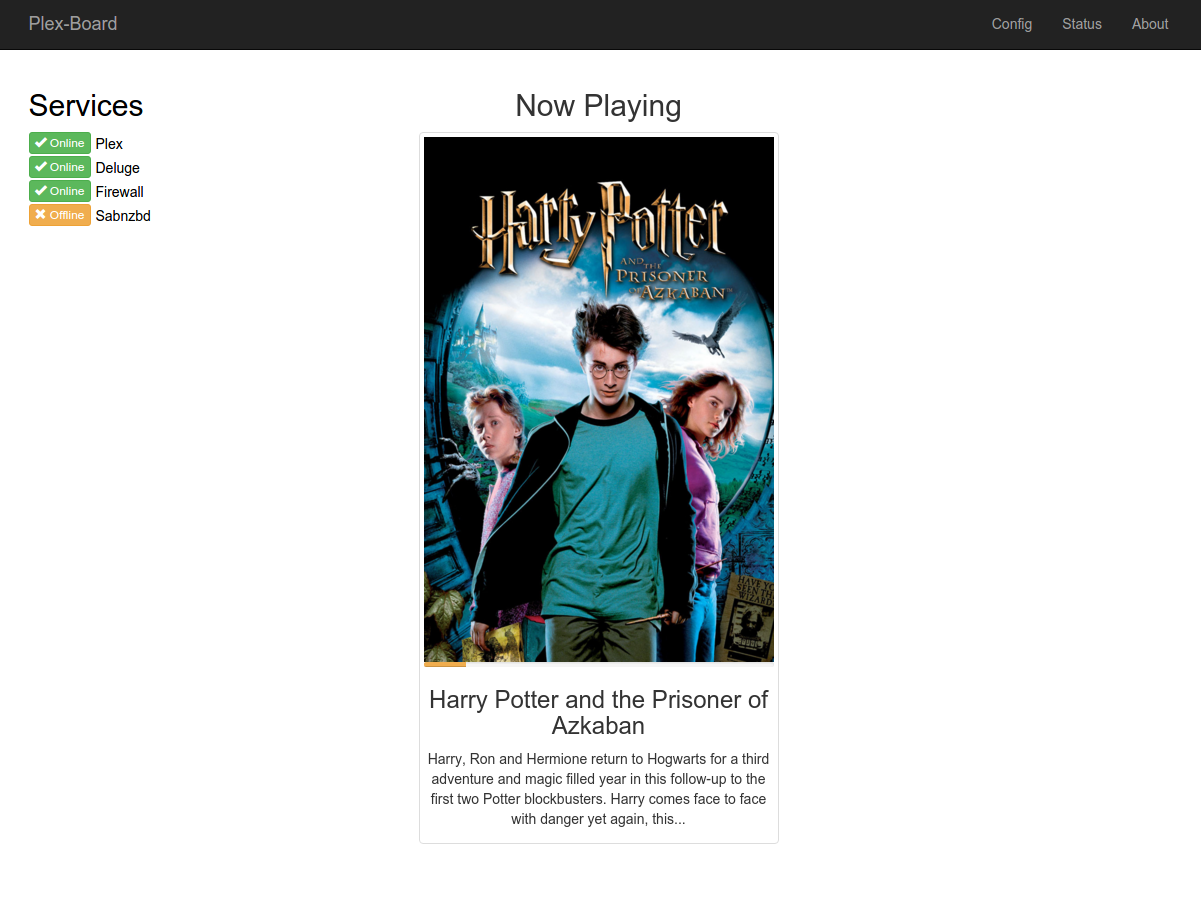 What is Plex-Board? Put simply, it is a dynamic dashboard for checking the status of multiple services related to Plex Media Server (Plex, Couchpotato, Sickrage, Deluge, Sabnzbd+, etc.).