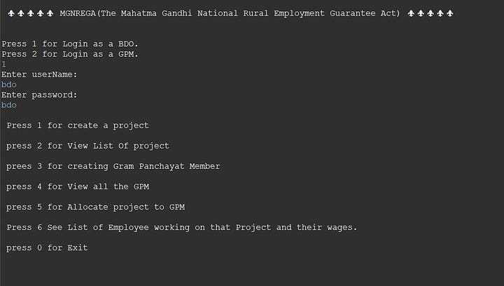 The MGNREGA was initiated with the objective of “enhancing livelihood security in rural areas by providing at least 100 days of guaranteed wage employment in a financial year, to every household whose adult members volunteer to do unskilled manual work. Completed the project with same functionalities. Created the BDO(Block Developement Officer) Login and GPM(Gram Panchayat Member) Login with their functionalities. Also Handled the Exceptions Caused by the wrong inputs.